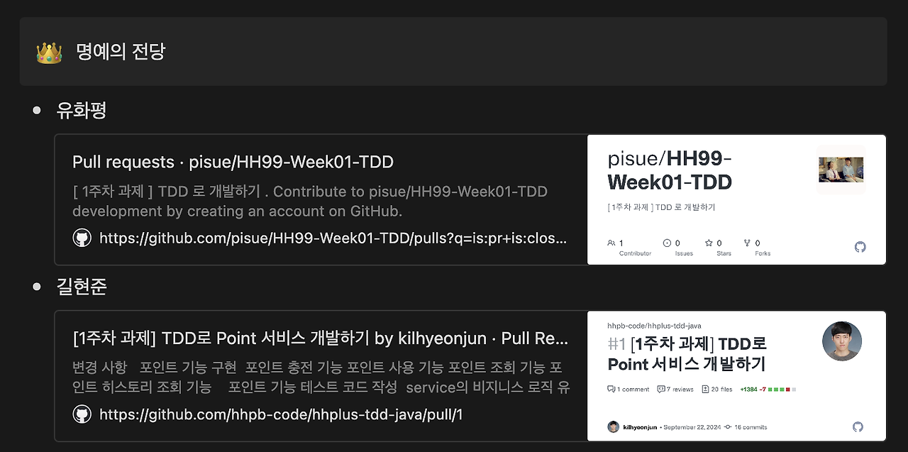 TDD로 Point 서비스를 개발했던 1주 차 과제에서, 저는 운 좋게도 명예의 전당에 오를 수 있었습니다. PR 작성 시 셀프 리뷰를 통해 질문이 있는 부분에 직접 코멘트를 남기며 리뷰어를 배려하는 태도가 긍정적으로 평가된 것 같습니다.